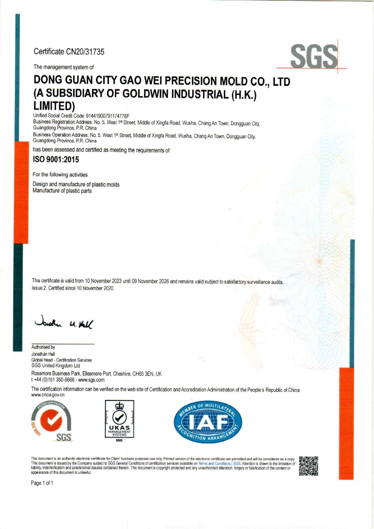 Established in 2002, Guangdong Goldwin Industrial Co., Ltd. is a certified high-tech enterprise specializing in high-precision molds and plastic injection manufacturing. Operating from a 14,000㎡ facility, we offer end-to-end solutions—from mold design and fabrication to injection molding, surface finishing, and global delivery.